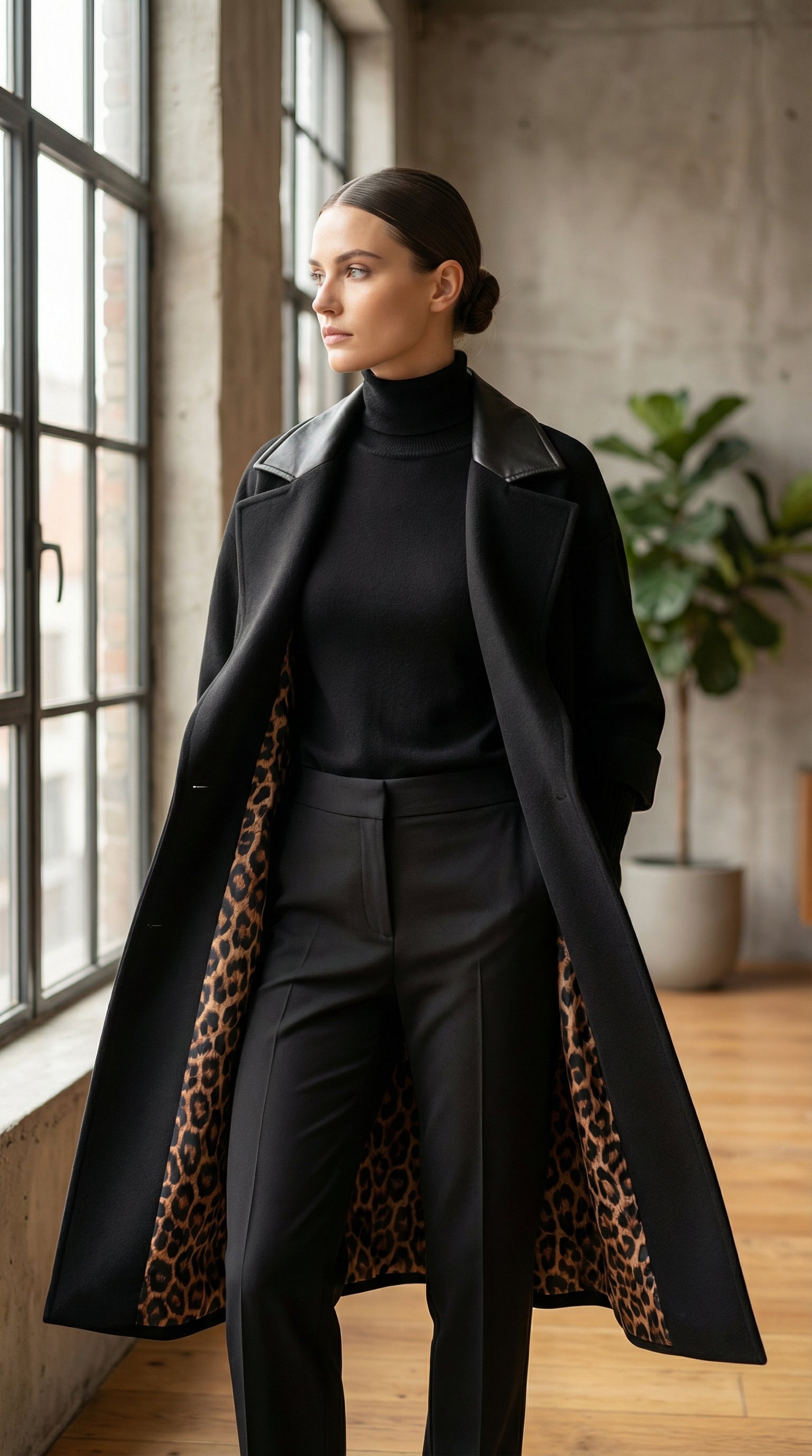 Abrigo negro de paño con mangas 3/4 y puños elásticos . La capucha y el interior está forrada con leopardo . Un abrigo super estiloso . Ahora a mitad de precio