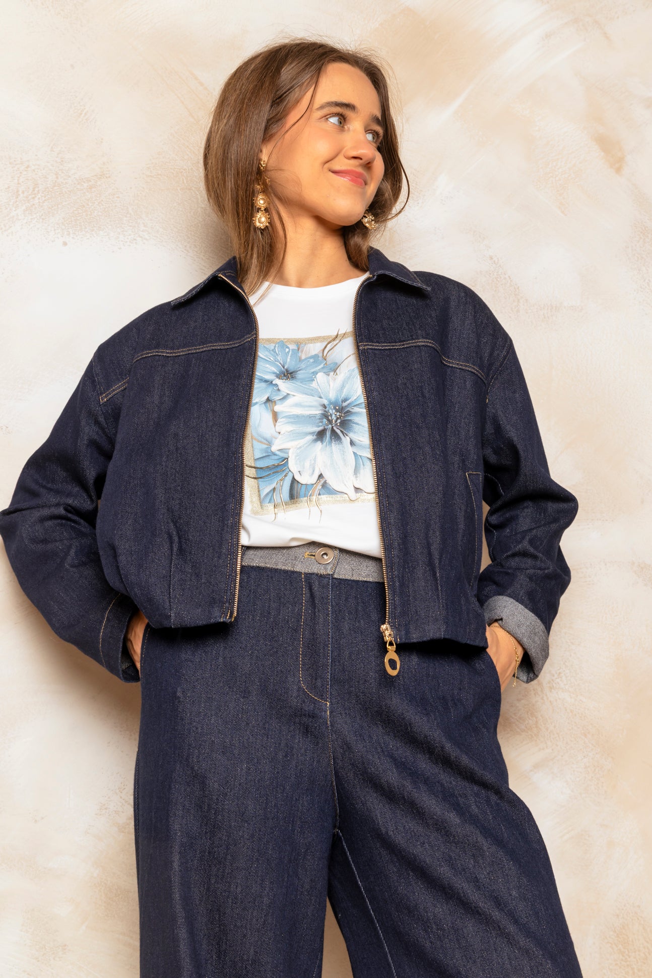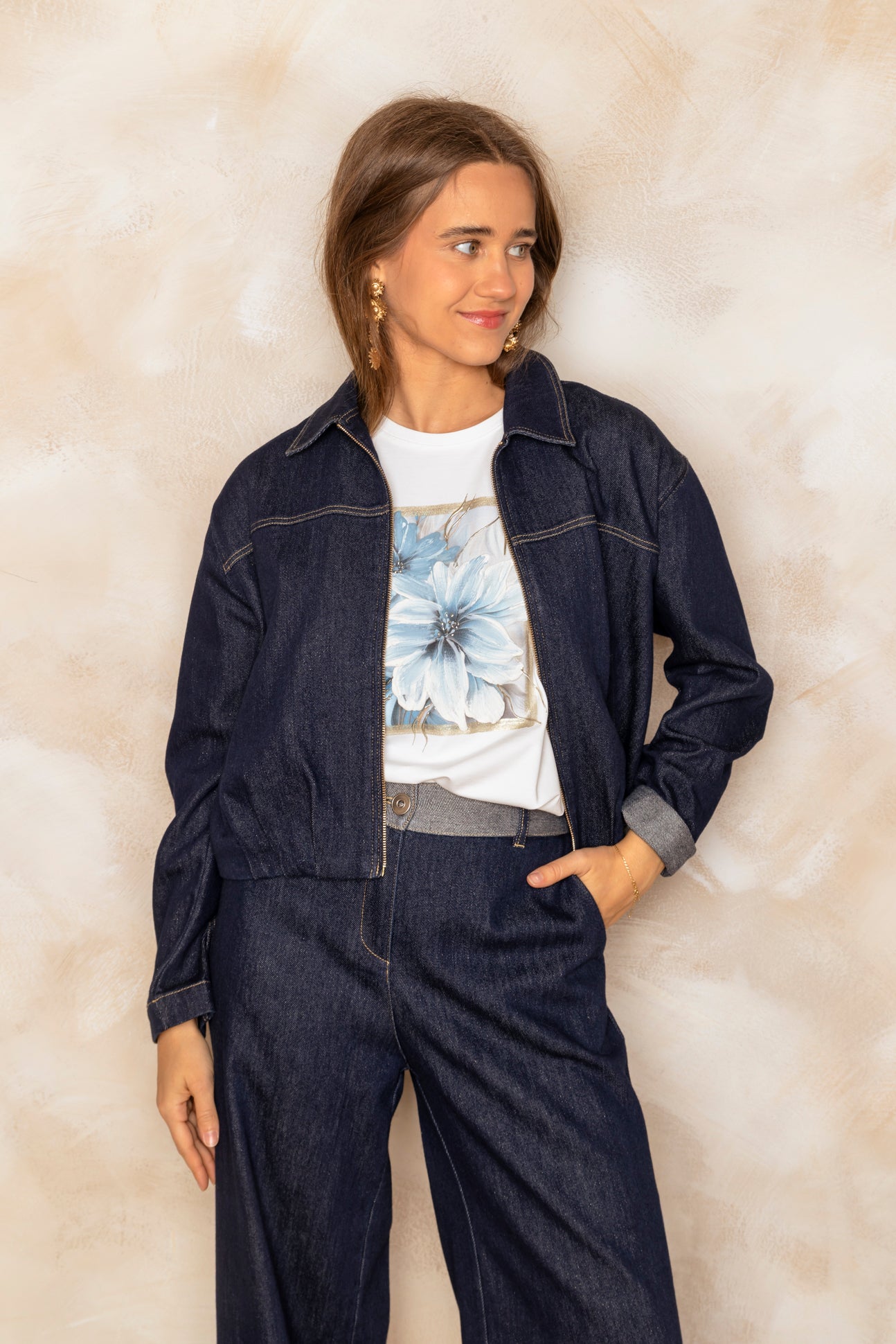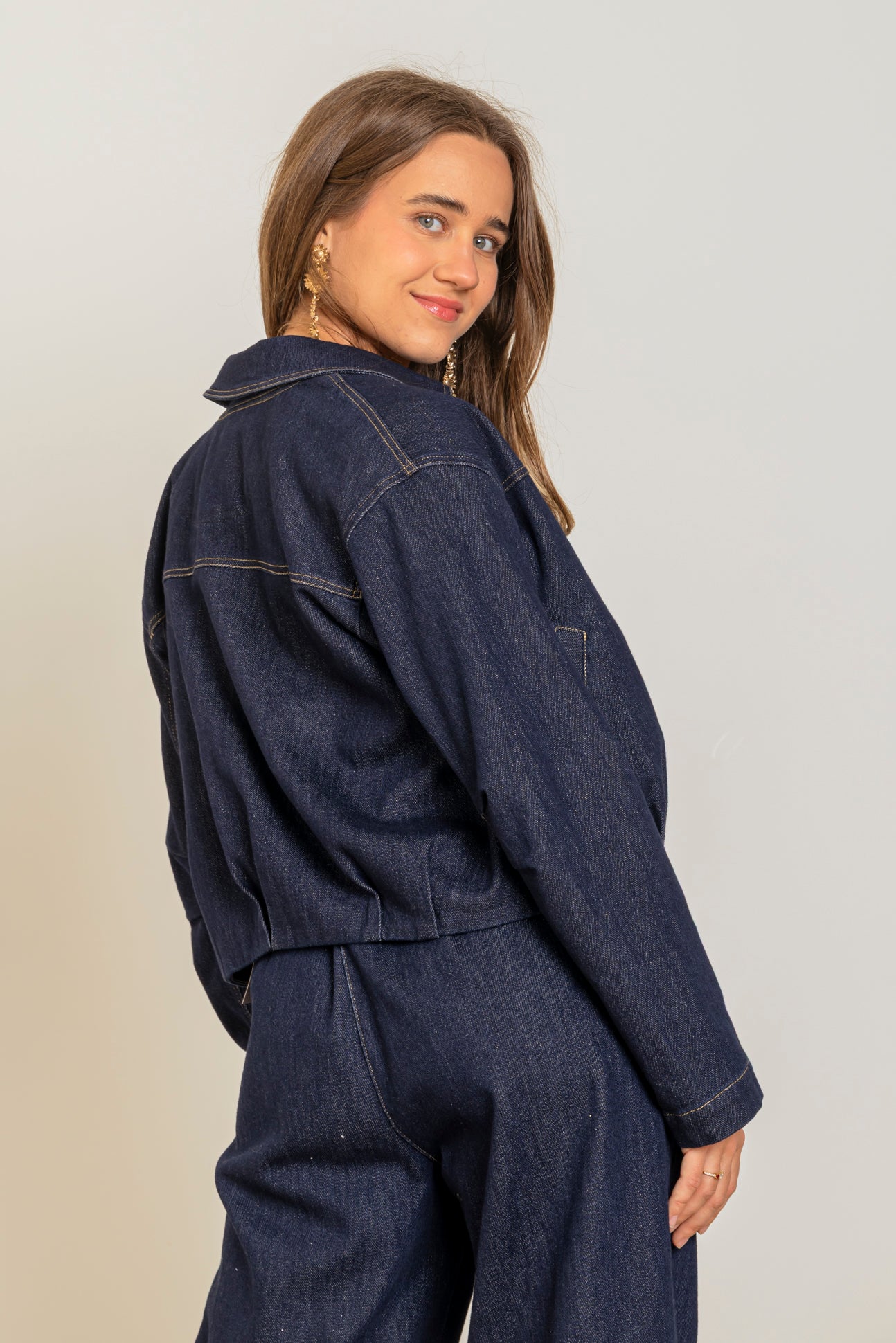 Su corte tipo bomber desestructurado aporta un aire actual y relajado, perfecto para mujeres que quieren ir cómodas pero con estilo. El tejido denim es suave y agradable, lo que hace que resulte muy fácil de llevar durante todo el día.
