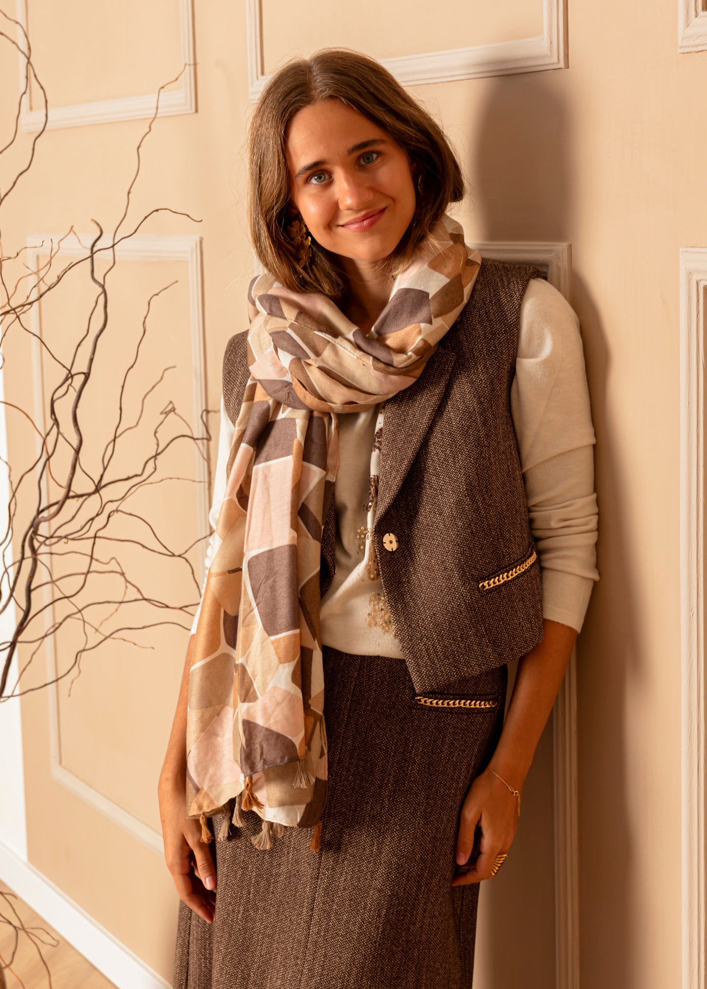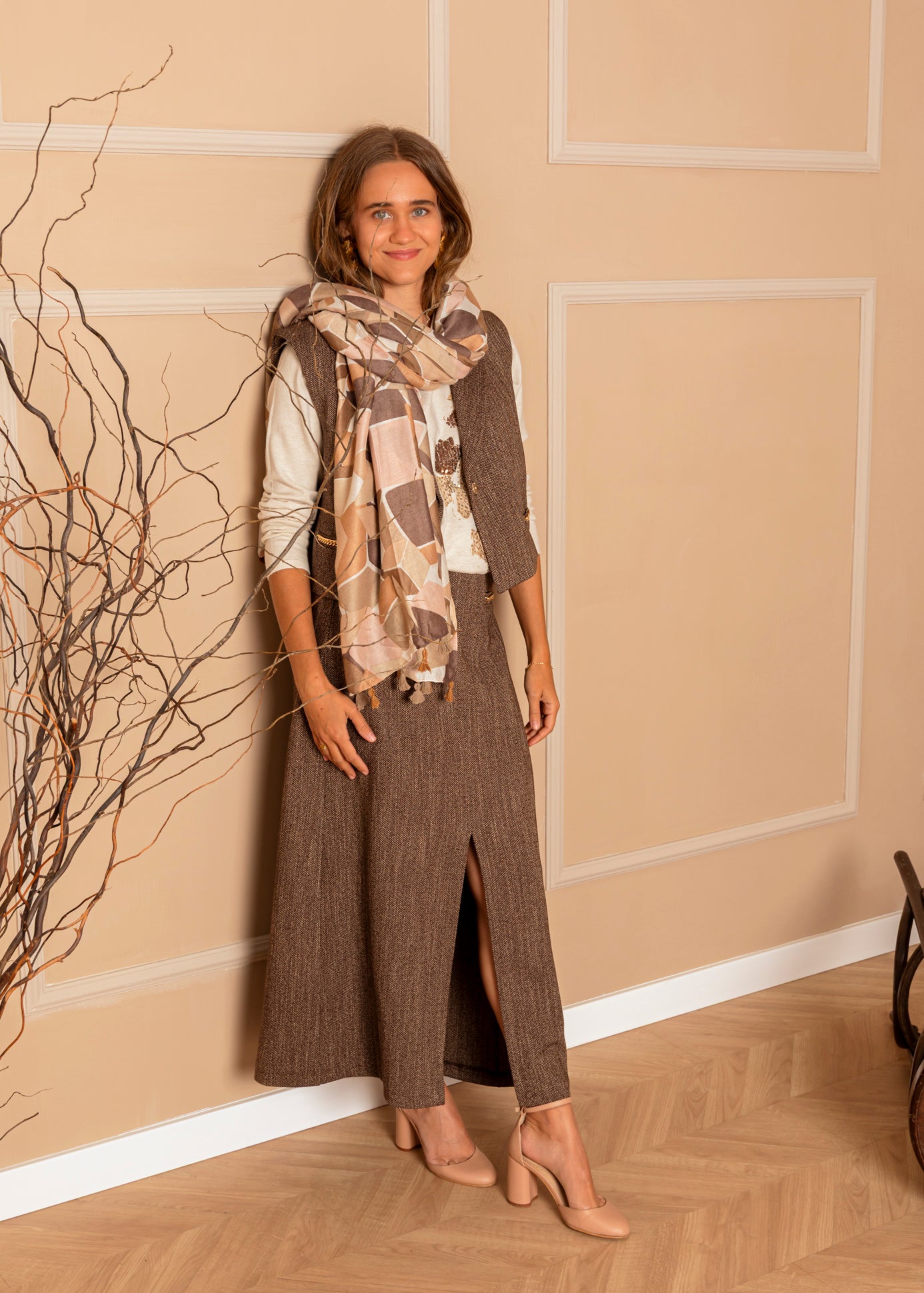 Chaleco corto con detalle de cadena en bolsillo . Ideal para completar el look con su falda.