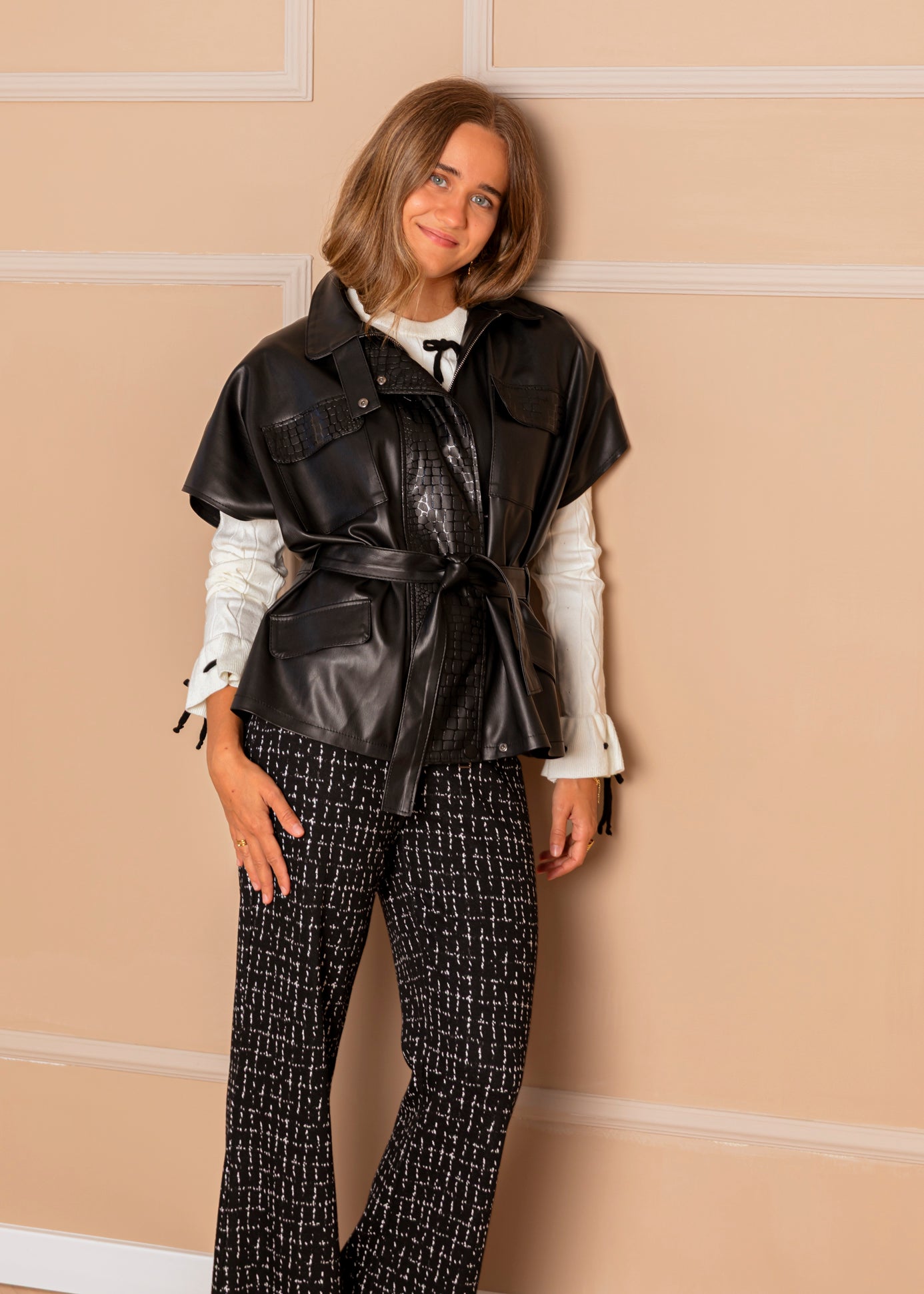 Chaleco tipo piel fina con bolsillos y solapa labrada. Para cambiar tu look de oficina en look de cena en un solo paso .