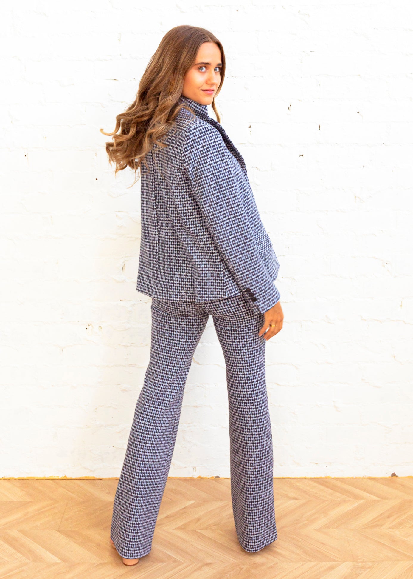 Chaqueta de cuadros azules en varias tonalidades suaves. Esta chaqueta un poco elástica y sin forrar se ajusta perfectamente al cuerpo . Tiene el chaleco y el pantalón a juego con lo que hace que este sea un conjunto super versátil.