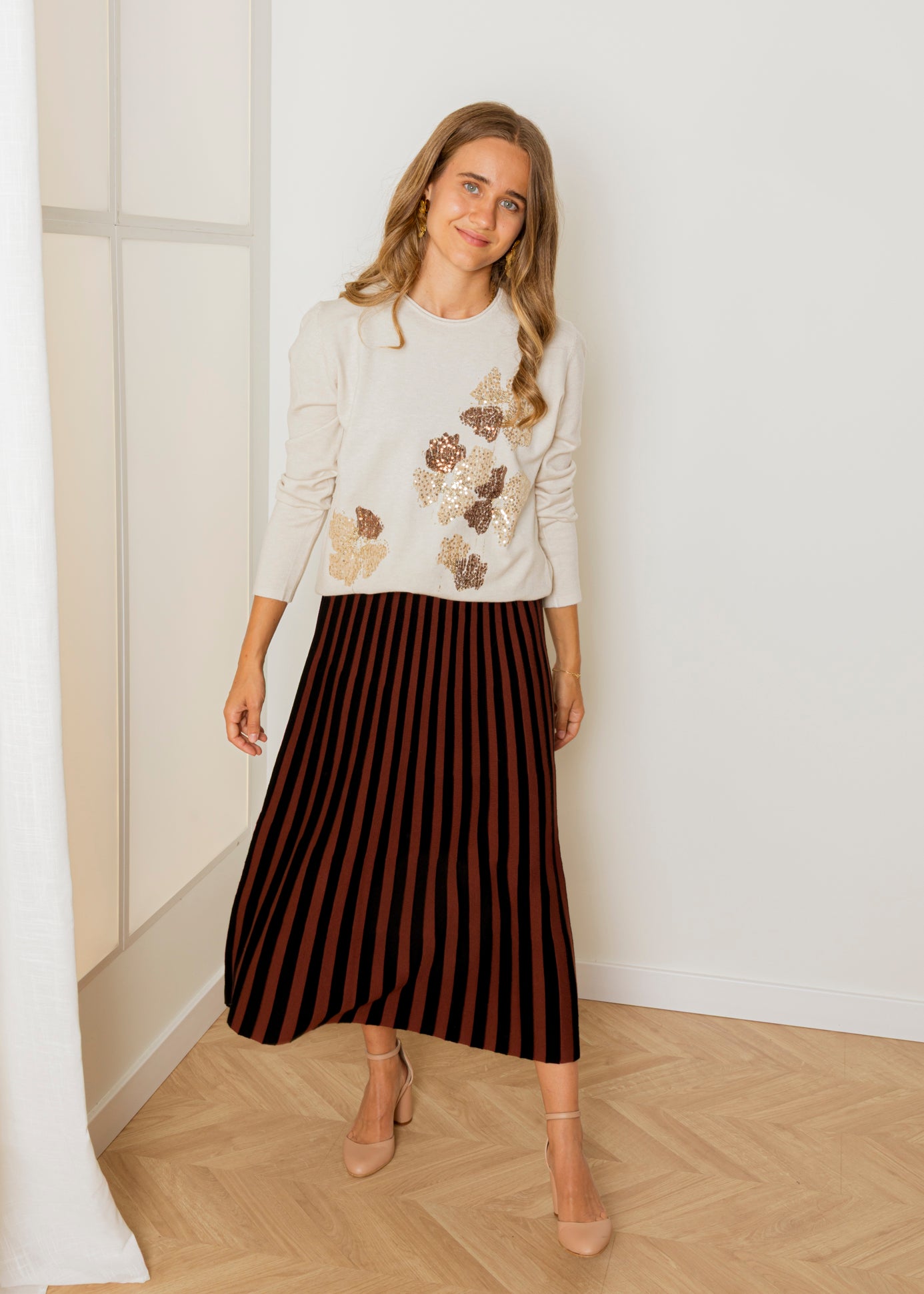 Falda midi de punto con rayas verticales cacao y negro. Alarga visualmente y se adapta con cintura elástica. Perfecta para oficina y planes de tarde.