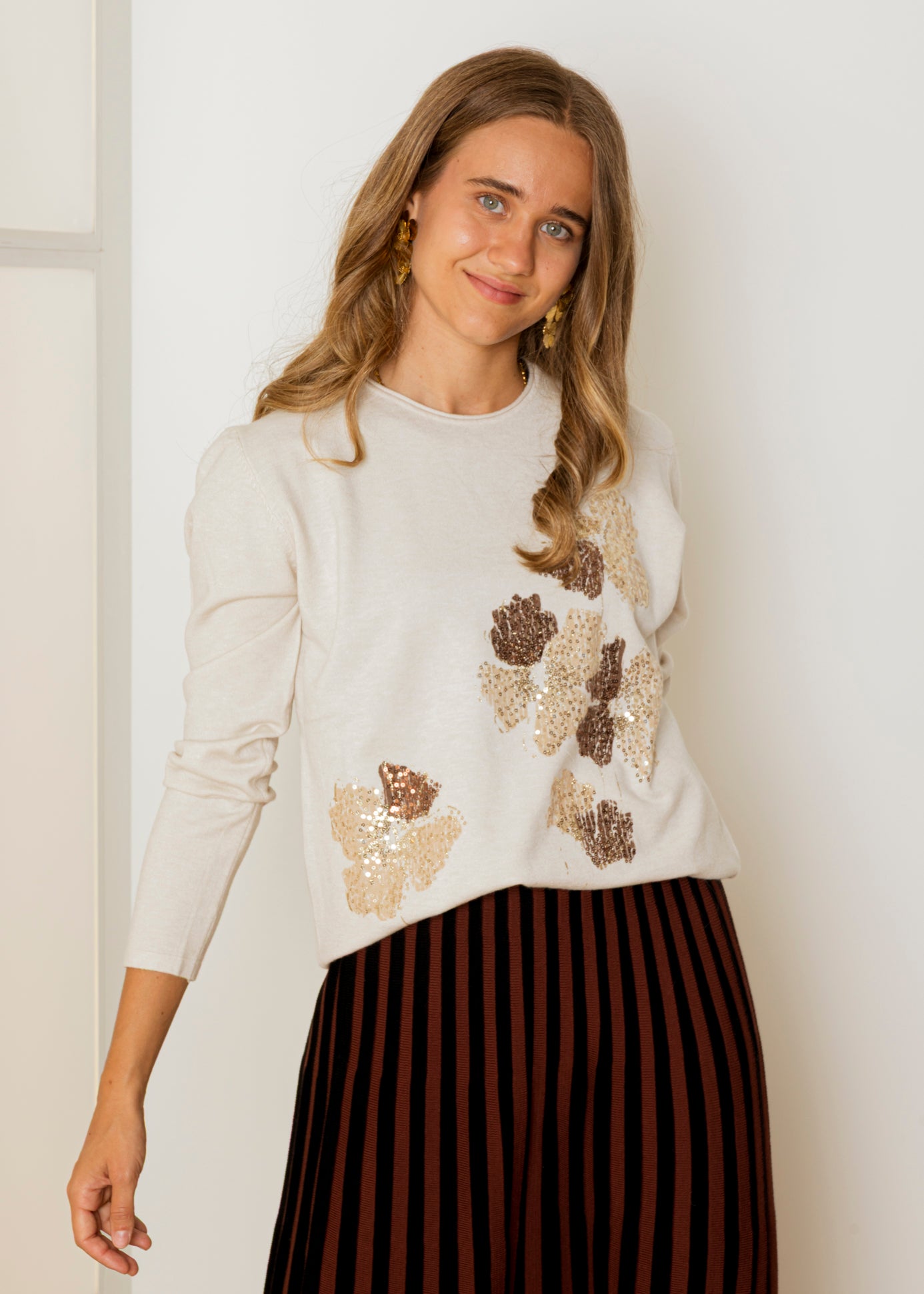 Jersey Bordado con pequeñas lentejuelas que hace que tu look quede ideal y diferente tanto con falda como con pantalón .Es un color muy fácil de combinar y que siempre queda  elegante.